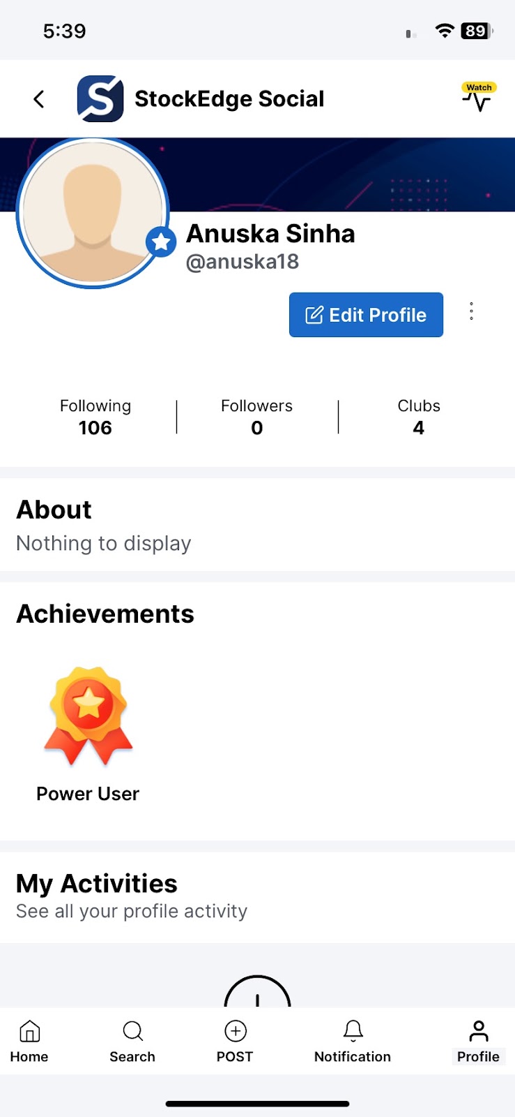 Your Power User badge will appear under the Achievement of your StockEdge Club profile.